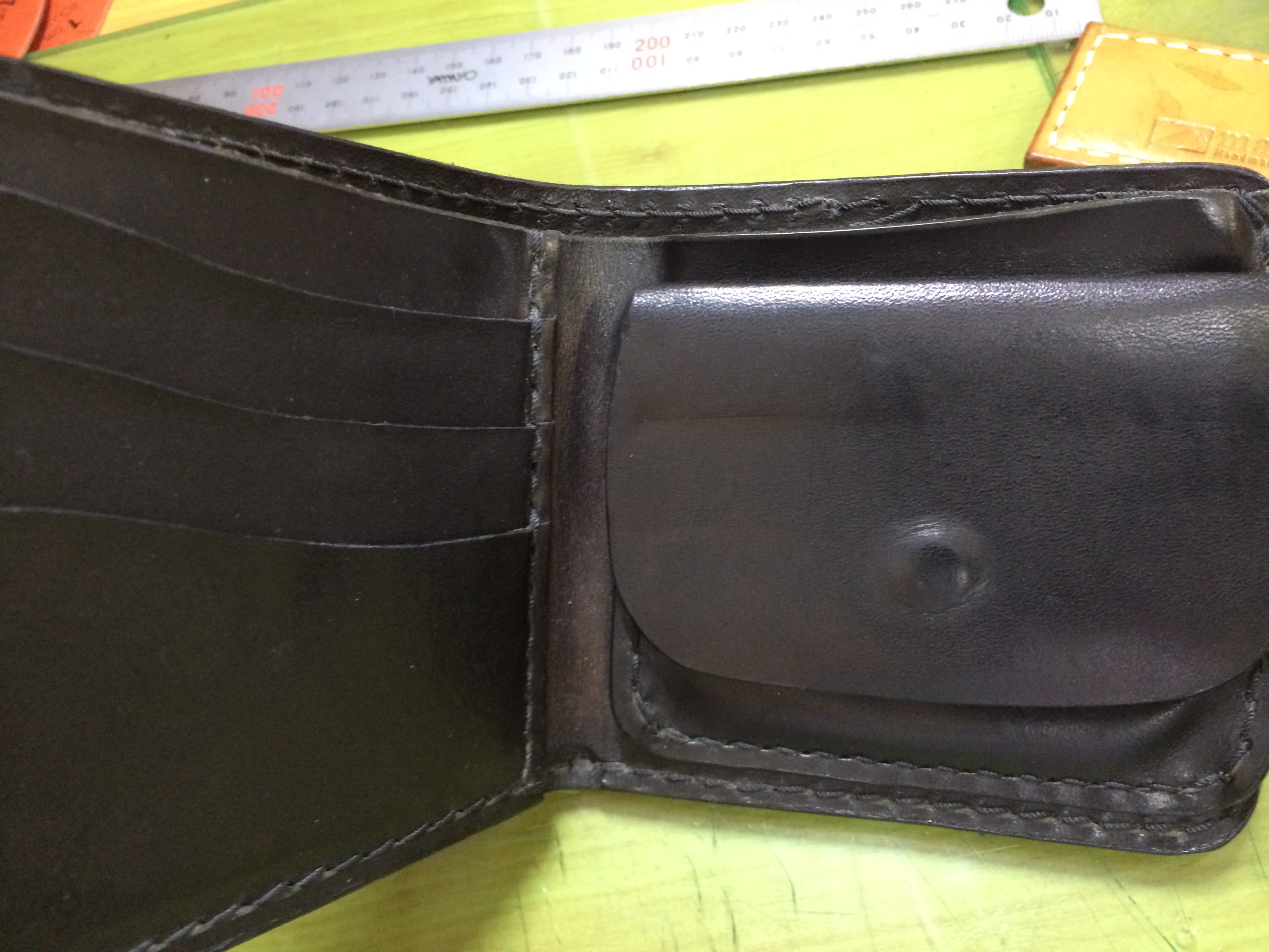 修理&メンテナンスの依頼 以前に2つ折り財布をご購入されたオーナー様より糸切れの修理とメンテナンスのご依頼を申し受けました。。 オーナー様がとても大事にお使い頂いているご様子が財布から感じられ感激いたしました。。 すごく綺麗にお使い頂いていますね。。 当店ではご購入頂いた商品の修理(糸切れなど)メンテナンスは無償でさせて頂いております。※注(その際にかかります送料(往路)のみオーナー様にご負担頂いております。)