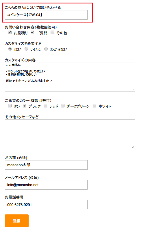 赤枠の「こちらの商品について問い合わせる」の内容は自動で表示されます。